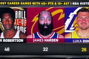 据统计,这是东契奇生涯第26场单场至少40分10助攻,历史第三多,仅次于大O和哈登。